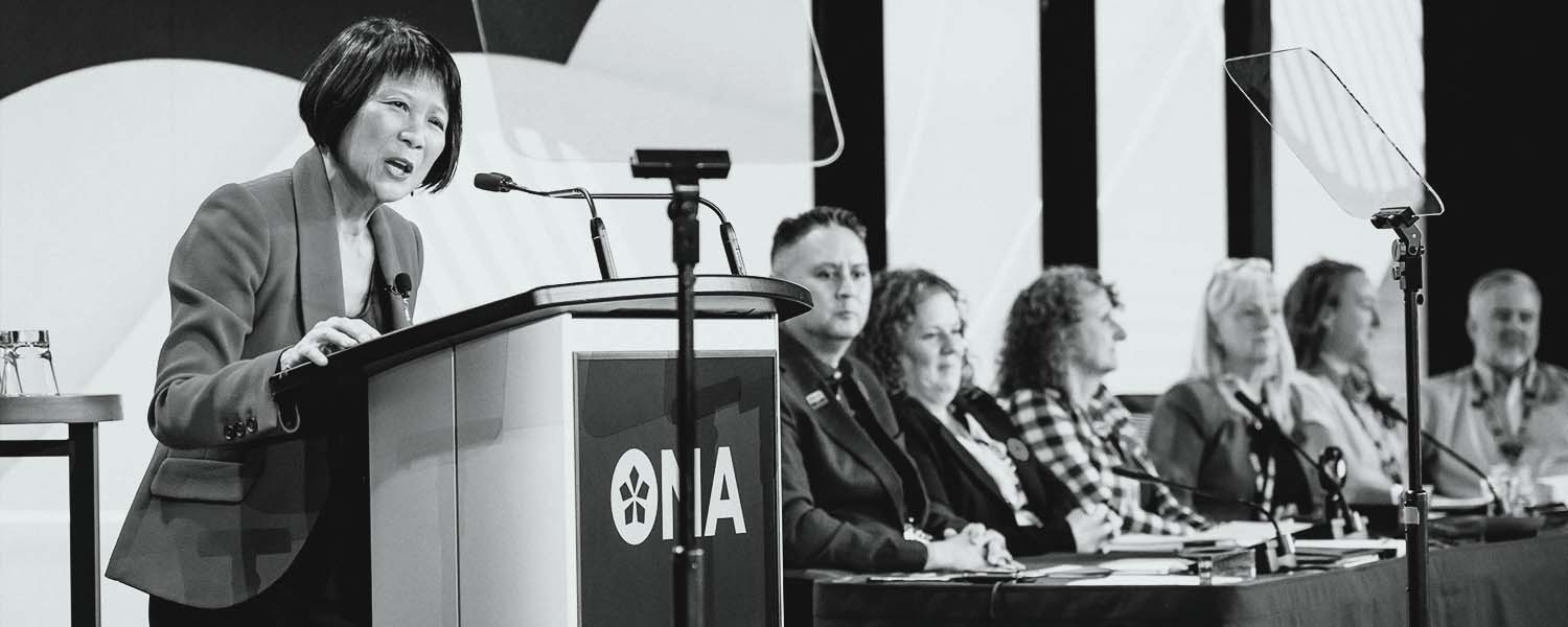 In a lively speech echoing the serious challenges members face, Toronto Mayor Olivia Chow stressed that together, we have the power to make change. “What’s happening in health care is the predictable results of decisions made by people who know better. But there’s another way. It starts with safe staffing, putting care over profit and treating violence against nurses and health-care professionals as the emergency it is.”