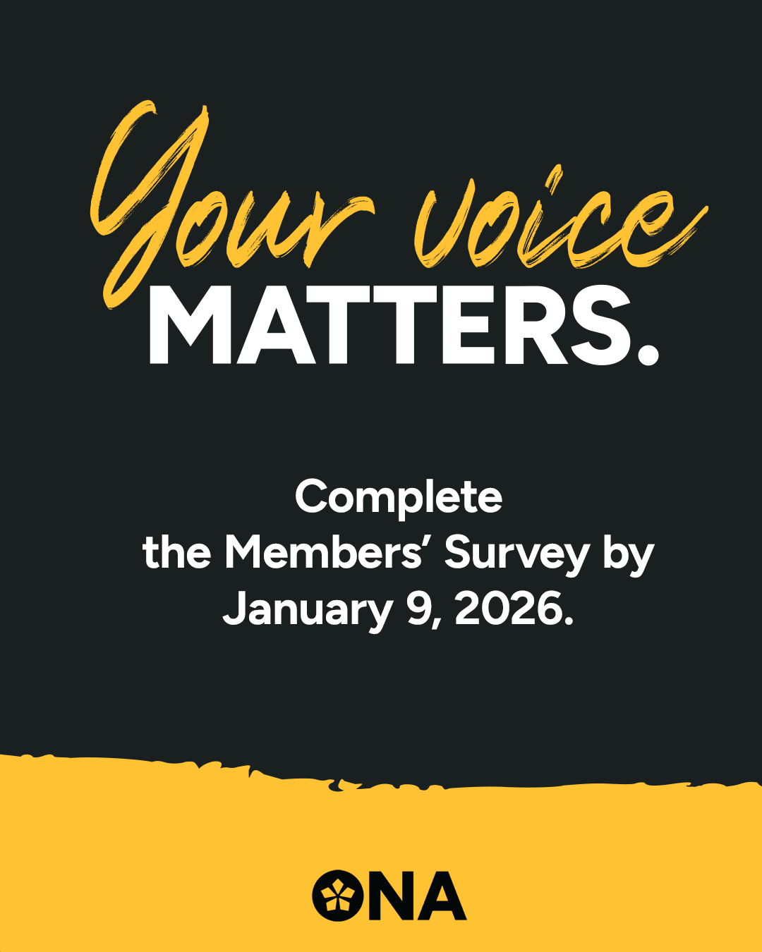 That’s why ONA conducts a members’ survey, every two years, that is open to all ONA members. This survey is an essential channel for our members to share information about their experiences — helping to ensure that members are at the heart of what we do as a union. This information will inform ONA’s urgent and long-term plans and advocacy efforts.